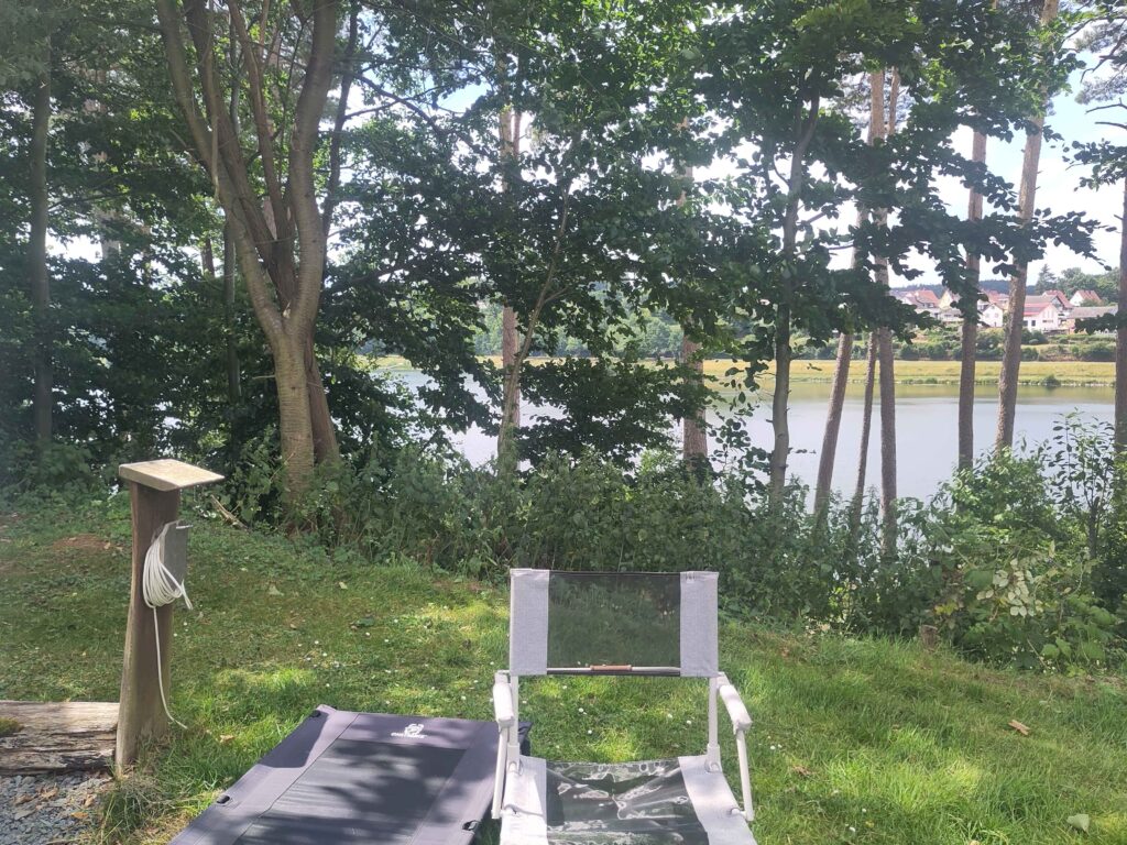 Das Gute war, dass ich im Voraus aussuchen konnte, wo ich stehen wollte. Ich habe mich also ganz nach hinten ins Eck gebucht, wo niemand vorbeikommt. Hier sind wir ein wenig geschützt. Wahrscheinlich ist es die privateste Ecke auf dem ganzen Platz, den ich uns da geangelt habe. Weiter vorne ist es laut. Die geschotterten Wege, auf denen man natürlich auch zu Fuss unterwegs ist, lassen kein leises Gehen zu. Stattdessen gibt der Boden bei jedem Schritt ein ‚Rrratschsch‘ von sich. Aber hier hinten, hier hinten ist es hübsch. Hier gibt es Baumschatten und direkten Blick auf den See.